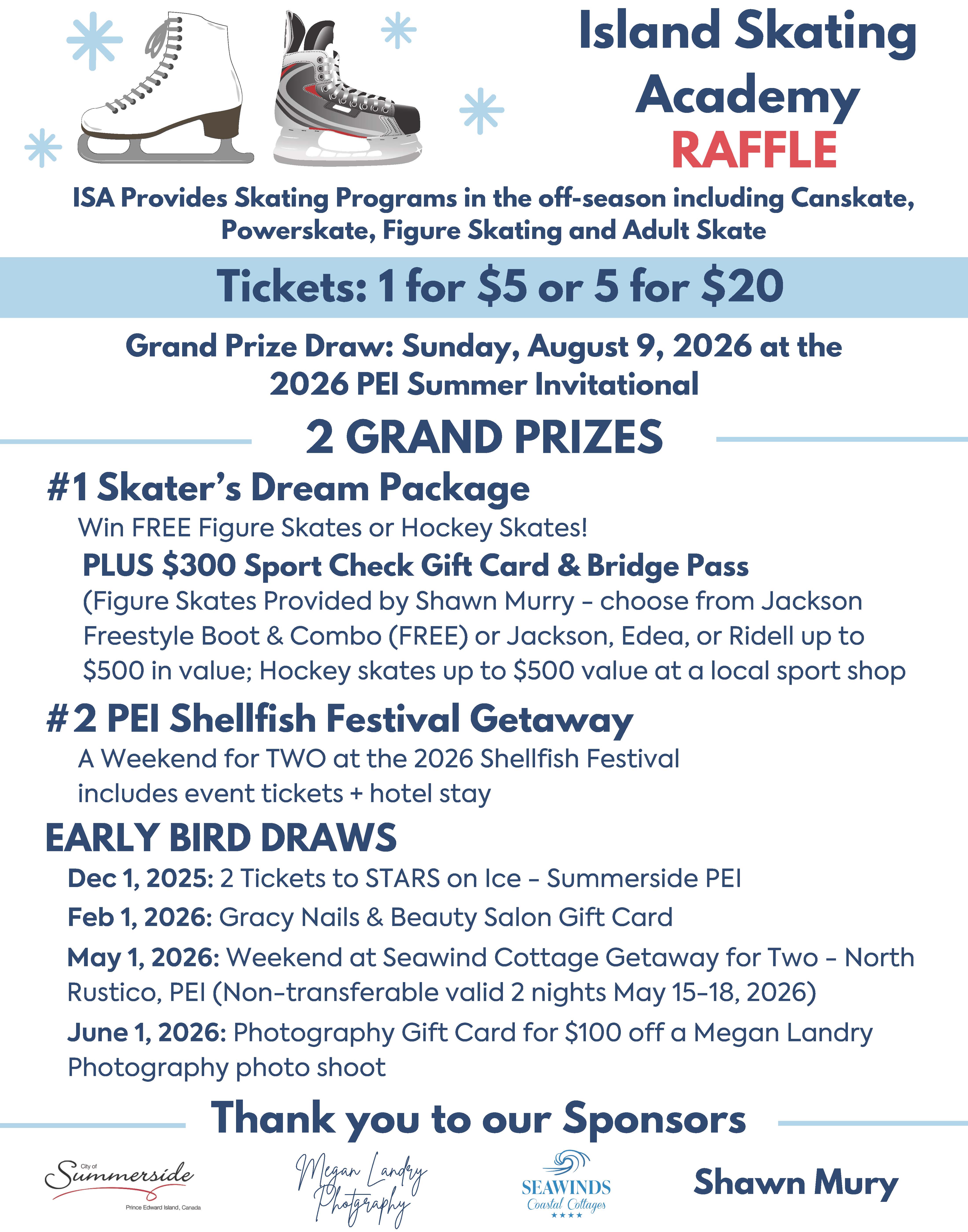 The Island Skating Academy, operated by Members of Skate Canada PEI Clubs, provides inclusive off-season programs in late Spring and a Summer Camp during the months of late April into August for all islanders. We offer all programs including Starskate (encompasses podium pathway), Canskate, Powerskate and Adult Skate.